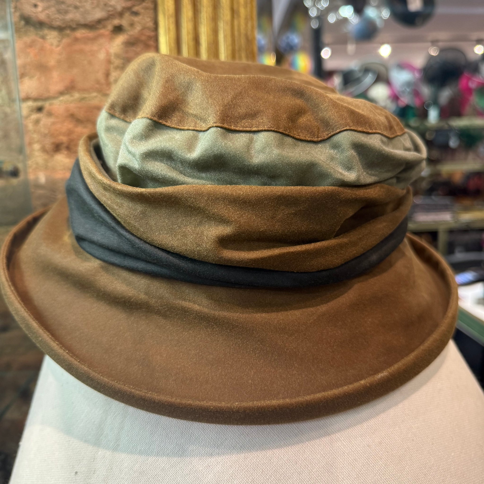 The fabulous tri-colour ladies Hamden waxed cotton rain hat with fleece lining for extra warmth.