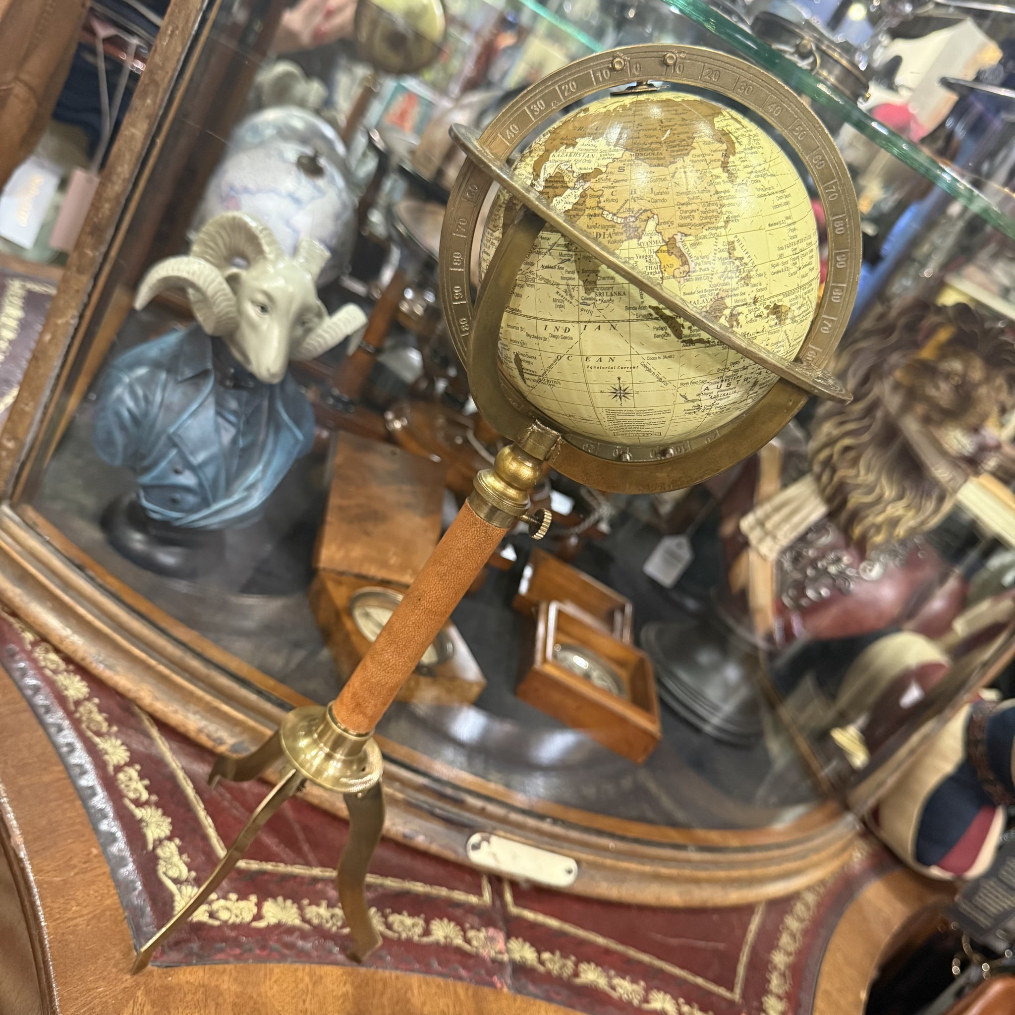 The decorative Henderson mini world globe on a leather and antique brass tripod base. Would look lovely on any bookshelf or desk.