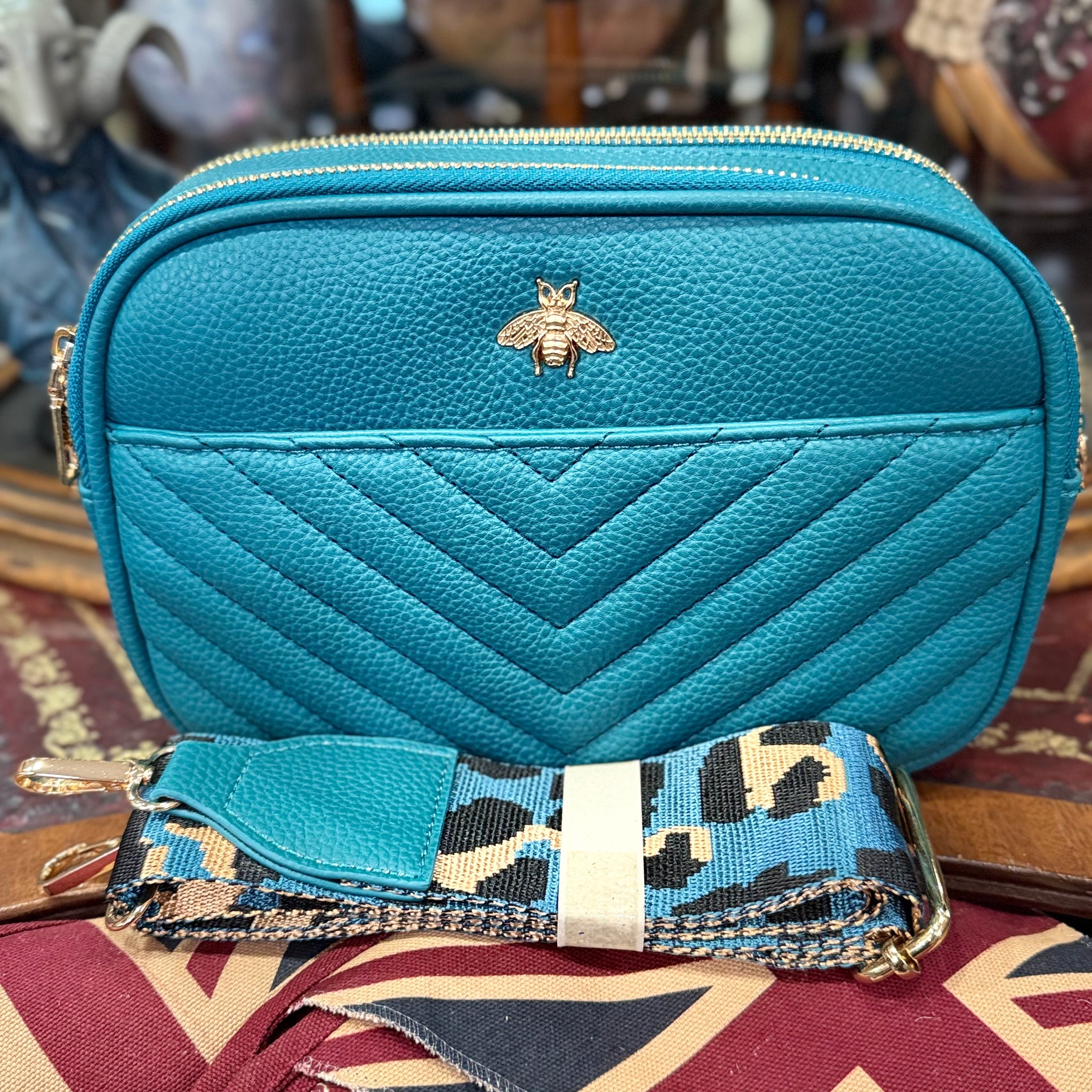 A double top compartment camera bag. Quilted magnetic front pouch with gold bee emblem.