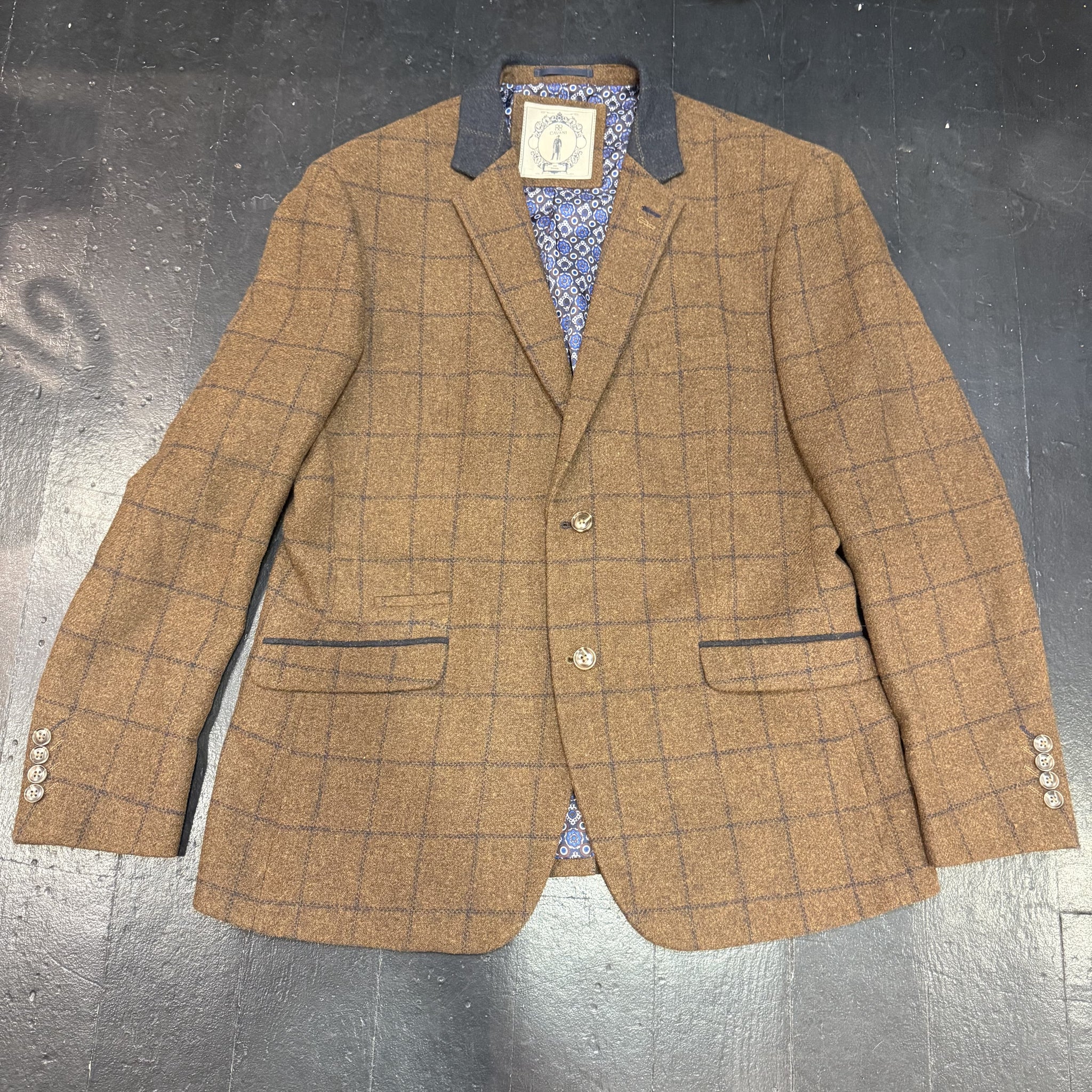 A fabulously stylish brown windowpane check jacket with two buttons and three pockets, blue fancy satin lining.